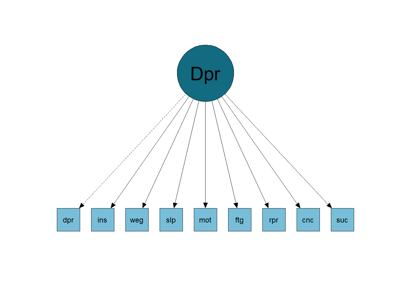 Below, we see the common factor model (Figure 3.1) of an instrument that measures major depression. In it, items measure aspects such as: feeling depressed, insomnia, weight gain, motor problems, fatigue, concentration problems, etc. We see from the image that the variation in scores on the items has a common cause, depression (that is, the higher the person’s level of depression, the more they report having these symptoms).