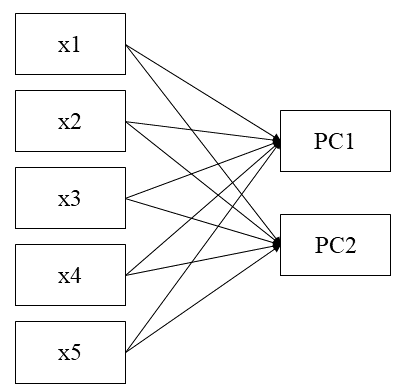 We have other types of models, like formative models. Formative models are usually analyzed using Principal Component Analysis, where the latent variables are formed by the manifest variables (or items). An example of a variable in the formative model is socioeconomic level, which can be explained by items such as income, place of residence, education, etc. Thus, this latent variable is a representation of the items. An example of a formative model can be seen in Figure 3.3.
