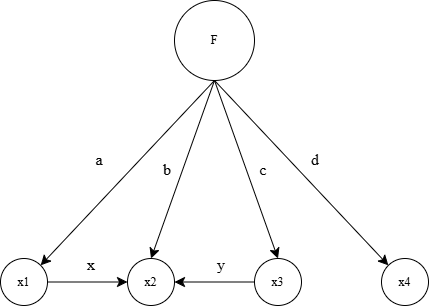 Consider the example from Glymour and Scheines (1986). In Figure 3.5, we have three treks between \(x1\) and \(x3\). The first trek is a direct edge from \(x3\) to \(x2\), with label \(y\). The second is a common cause from the latent variable \(F\), with labels \(b\) and \(c\). The last one is a common cause from \(F\) through variable \(x1\), with labels \(a\) and \(x\) on the path from \(F\) through \(x1\) to \(x2\), and label \(c\) on the path to \(x3\) directly from \(F\).