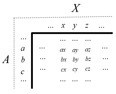 Such conjoint systems are easily visually contemplated if they are thought of as composing a matrix where the rows are values of \(A\), the columns, values of 𝑋, and the cells, values of \(𝑃\). Let \(𝑎\), \(𝑏\), \(𝑐\),… etc. be values of \(𝐴\), \(𝑥\), \(𝑦\), \(𝑧\),… etc. be values of \(𝑋\) and, since \(𝑃 = 𝑓(𝐴, 𝑋)\), the pairs, \(𝑎𝑥\), \(𝑎𝑦\),… , \(𝑐𝑦\), \(c𝑧\),… denote (possibly identical) values of \(P\). Such a matrix is schematically represented by Figure 4.1 to help understand a visual representation of conditions (1) - (3).