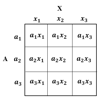 Despite its simplicity, double cancellation is a condition that has considerable power. It strongly restricts the order in \(P\). This can be illustrated in a \(3𝑋3\) matrix. Let \(𝑎1\), \(𝑎2\), and \(𝑎3\) be three values of \(𝐴\) and \(𝑥1\), \(𝑥2\) and \(𝑥3\) be three values of \(𝑋\). The resulting conjoint matrix is illustrated in Figure 4.2.