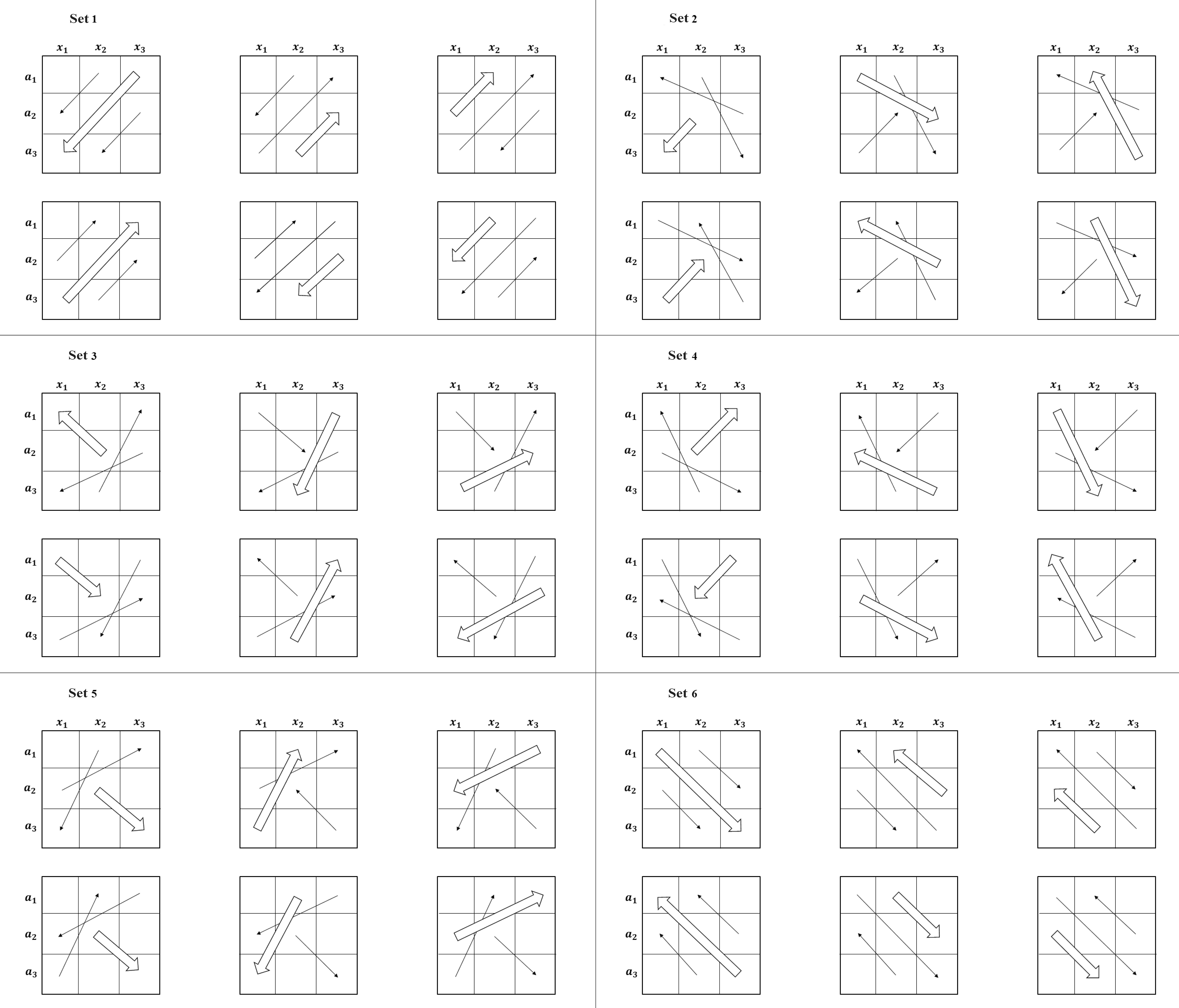 They are not all logically independent of each other. In this, they are in six different sets, each with six. Within each set, the relevant order relations are between the same three values of \(𝑃\) (or matrix cells). Arrows have been used to indicate these relationships (i.e., \(𝑎𝑥 ≥ 𝑏𝑦\) is represented by \(ax\) -> \(by\) , the single-line arrows represent the antecedent orders and double-line arrows represent the consequent order.