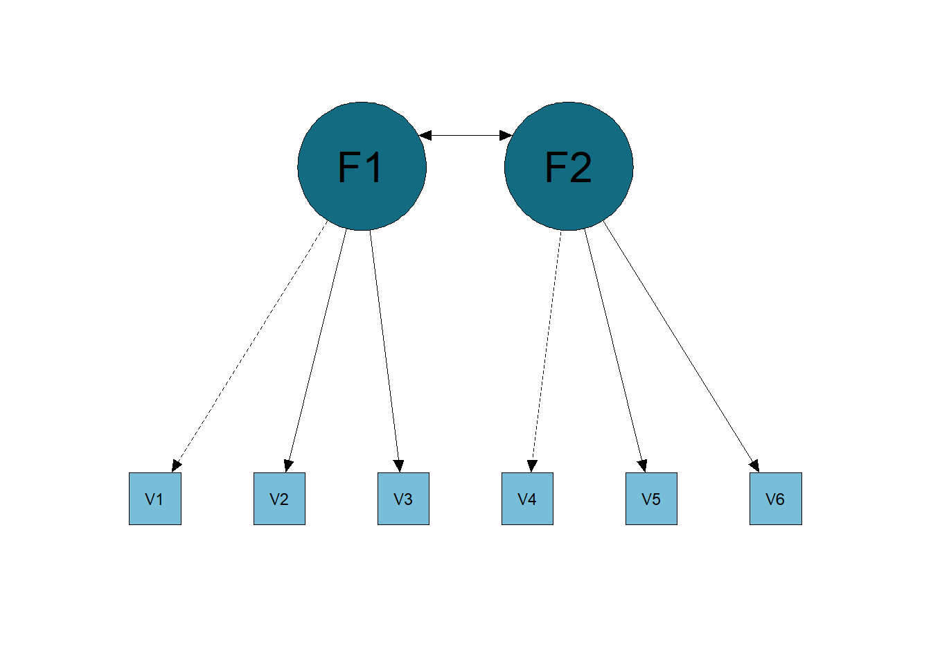 As for the CFA, we can call it the Restricted Model, that is, we impose some restrictions on the model, for example, not having cross-loadings of a factor with items from another factor. The restricted model is exemplified in the image below (Figure 6.2).